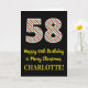 The front of this fun and simple Christmas themed and birthday themed December 25th birthday greeting card design features a large number "58" with a green, white, and red stripes pattern, along with the message "Happy 58th Birthday & Merry Christmas,", and a customizable name. The background of the front is colored black. The inside features a custom birthday greeting message, or could perhaps be cleared and left blank if a message is to be written by hand instead. A personalized birthday card like this might be a fun way to acknowledge somebody’s fifty eighth birthday that also falls on December 25th (Christmas Day). [~Z0000405]