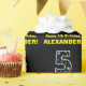 This fun birthday themed wrapping paper design features a large number "5", filled with a pattern of decorative star shapes having various sizes and colours. It also features the message "Happy 5th Birthday,", and an editable name. The background is coloured black. Wrapping paper like this might be used when giving a gift or present in honour of somebody’s fifth birthday. [~Z0000429]