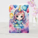 A colourful watercolor illustration of a wide-eyed girl with flowing rainbow hair, wearing a blue and green dress with the number "5" on it. She holds a yellow balloon and wears a gold-striped party hat adorned with blue flowers. The background is filled with vibrant balloons and festive splashes of colour in pink, purple, and blue tones, creating a joyful birthday scene.