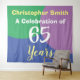 Celebrate a birthday with a personalised tapestry backdrop wall hanging showing recipient's name, and number of years. Party backdrop for a 65 year old.