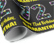 This fun birthday themed wrapping paper design features a large number "72" filled with a pattern of decorative star shapes of various sizes and colours, along with the message "Happy 72nd Birthday,", and a custom name. The background is coloured black. Birthday themed wrapping paper like this might be used when giving a gift or present in celebration of somebody’s seventy-second birthday. [~Z0000429]
