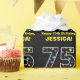This fun birthday-themed wrapping paper design features a large number "75" filled with a pattern of decorative star shapes of various sizes and colours, along with the message "Happy 75th Birthday,", and a personalised name. The background is coloured black. Fun wrapping paper like this might be used when wrapping presents being given to somebody in celebration of their seventy fifth birthday. [~Z0000429]