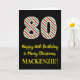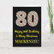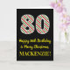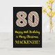 The front of this fun and simple Christmas-themed and birthday-themed December 25th birthday greeting card design features a large number "80" with a red, white, and green stripes pattern, along with the message "Happy 80th Birthday & Merry Christmas,", and a customizable name. The background of the front is colored black. The inside features an editable birthday greeting message, or could perhaps be cleared and left blank if a message is to be written by hand instead. A personalized birthday card like this might be a fun way to acknowledge somebody’s eightieth birthday that also falls on December 25th (Christmas Day). [~Z0000405]