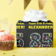 This fun birthday-themed wrapping paper design features a large number "85", filled with a pattern of decorative star shapes of various colours and sizes. It also features the message "Happy 85th Birthday,", and a customisable name. The background is coloured black. Fun wrapping paper like this might be used when wrapping presents being given to somebody in celebration of their eighty fifth birthday. [~Z0000429]