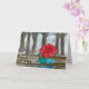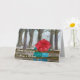 A happy anniversary card featuring a couple under a bright red umbrella on a drizzly day enjoying a quiet moment together on a park bench hand-painted with watercolor. Nice to personalise with the names of the special couple. On the inside is a coordinating shade of grey and a message you can edit to say what you'd like.