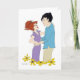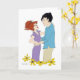 A young girl with red hair and a young man with black hair are holding each other and they are surrounded by yellow flowers.