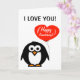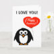 Happy Anniversary greeting card with cute penguin holding a red heart balloon.