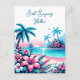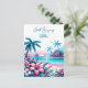 Pixal art that looks like needlepoint that depicts a picture of a blue ocean, palm trees and pink tropical flowers. Happy Anniversary.