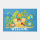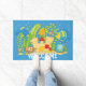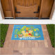 This cute, aquarium theme, welcome doormat features various, happy, aquarium fish with a sandcastle, diver's helmet, aquarium plants, and air bubbles on a pretty, blue background.