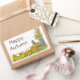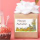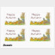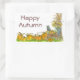 Autumn stickers decorated with a row of pumpkins, little wooden wheelbarrow and bouquets of sunflowers and dried corn painted in watercolor.