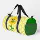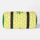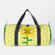 This awesome Gym bag features a graphic image of a cute yellow bumblebee with black stripes, eyes, antennae and legs. It has pretty blue and white wings. The bee is sitting on the middle of a golden yellow sunflower. The flower has a green stalk and three leaves. The message "happy bee day" appears spread over the three leaves. The background is composed of a yellow honeycomb pattern.