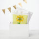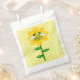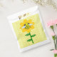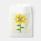 This awesome pack of 50 favour bags features a graphic image of a cute yellow bumblebee with black stripes, eyes, antennae and legs. It has pretty blue and white wings. The bee is sitting on the middle of a golden yellow sunflower. The flower has a green stalk and three leaves. The message "happy bee day" appears spread over the three leaves. The background is composed of a yellow honeycomb pattern.