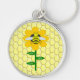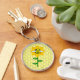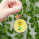 This fun Christmas keychain features a graphic image of a cute yellow bumblebee with black stripes, eyes, antennae and legs. It has pretty blue and white wings. The bee is sitting on the middle of a golden yellow sunflower. The flower has a green stalk and three leaves. The message "happy bee day" appears spread over the three leaves. The background is composed of a yellow honeycomb patter