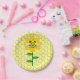 This awesome paper party plate features a graphic image of a cute yellow bumblebee with black stripes, eyes, antennae and legs. It has pretty blue and white wings. The bee is sitting on the middle of a golden yellow sunflower. The flower has a green stalk and three leaves. The message "happy bee day" appears spread over the three leaves. The background is composed of a yellow honeycomb pattern.