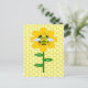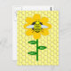 This cute postcard features a graphic image of a cute yellow bumblebee with black stripes, eyes, antennae and legs. It has pretty blue and white wings. The bee is sitting on the middle of a golden yellow sunflower. The flower has a green stalk and three leaves. The message "happy bee day" appears spread over the three leaves. The background is composed of a yellow honeycomb pattern.