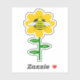 This awesome shaped sticker features a graphic image of a cute yellow bumblebee with black stripes, eyes, antennae and legs. It has pretty blue and white wings. The bee is sitting on the middle of a golden yellow sunflower. The flower has a green stalk and three leaves. The message "happy bee day" appears spread over the three leaves.