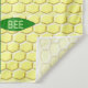This awesome tapestry features a graphic image of a cute yellow bumblebee with black stripes, eyes, antennae and legs. It has pretty blue and white wings. The bee is sitting on the middle of a golden yellow sunflower. The flower has a green stalk and three leaves. The message "happy bee day" appears spread over the three leaves. The background is composed of a yellow honeycomb pattern.