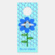 This awesome door hanger features a graphic image of a cute blue bumblebee with bright blue stripes, black eyes, blue antennae and black legs. It has pretty blue and white wings. The bee is sitting on the middle of a pretty blue sunflower. The flower has a green stalk and three leaves. The message "Bee Day boy" appears spread over the three leaves. The background is composed of a pale blue honeycomb pattern.