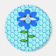 This awesome magnet features a graphic image of a cute blue bumblebee with bright blue stripes, black eyes, blue antennae and black legs. It has pretty blue and white wings. The bee is sitting on the middle of a pretty blue sunflower. The flower has a green stalk and three leaves. The message "Bee Day boy" appears spread over the three leaves. The background is composed of a pale blue honeycomb pattern.