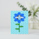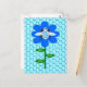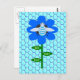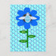 This cute postcard features a graphic image of a cute blue bumblebee with bright blue stripes, black eyes, blue antennae and black legs. It has pretty blue and white wings. The bee is sitting on the middle of a pretty blue sunflower. The flower has a green stalk and three leaves. The message "Bee Day boy" appears spread over the three leaves. The background is composed of a pale blue honeycomb pattern.