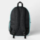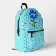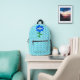 This awesome backpack features a graphic image of a cute blue bumblebee with bright blue stripes, black eyes, blue antennae and black legs. It has pretty blue and white wings. The bee is sitting on the middle of a pretty blue sunflower. The flower has a green stalk and three leaves. The message "Bee Day boy" appears spread over the three leaves. The background is composed of a pale blue honeycomb pattern.