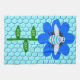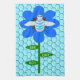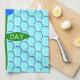 This awesome kitchen towel features a graphic image of a cute blue bumblebee with bright blue stripes, black eyes, blue antennae and black legs. It has pretty blue and white wings. The bee is sitting on the middle of a pretty blue sunflower. The flower has a green stalk and three leaves. The message "Bee Day boy" appears spread over the three leaves. The background is composed of a pale blue honeycomb pattern.