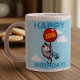 Use "Personalise this template" to change the age or "HAPPY BIRTHDAY!" text, text changes are reflected on both sides. Make a fun birthday gift of this novelty mug, featuring a cute opossom in a striped party hat, floating by on a big red balloon while blowing a star spangled party blower.