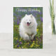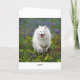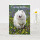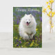 Aww...who can resist the sweet face of a happy American Eskimo puppy dog? This fun Birthday greeting card features a white American Eskimo pup running through a field of purple and yellow flowers.