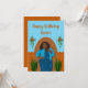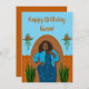 This design features a curvy African American beauty with a blue jacket and dress on a terra cotta colored wall with plants and blue background. Customize the message inside.