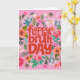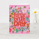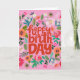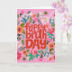Cheerful birthday greeting card featuring bold red “Happy Birthday” lettering surrounded by colorful hand-painted flowers and leaves on a bright pink background. A joyful floral design perfect for friends, family, or anyone who loves vibrant botanical illustrations. Original artwork by Caroline Bonne Müller