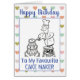 Cake maker cartoon. Woman is at top of a stepladder icing a cake. Personalize with your choice of wording and inside message. Ideal funny birthday card for a cake maker.