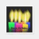 Close up of colourful glowing birthday candles on black background with Happy Birthday text.