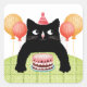 Funny children Sticker with birthday cat, chocolate cake and balloons.