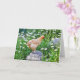 This birthday card features a buff orpington chicken sitting on a wooden mushroom surrounded by daisies.