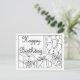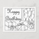 This beautiful black and white line drawing is ready to be coloured in, for a unique DIY way to celebrate a birthday. This card features the phrase "Happy Birthday" and an image of presents and balloons.