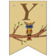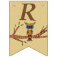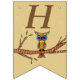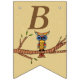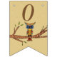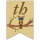 This flag shaped bunting Happy Birthday banner is light brown with an abstract colourful owl with big round eyes sitting on a brown tree branch with leaves.  Customise the birthday year with the templates.