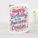 The design features the playful phrase “Happy Birthday to My Awesome Cousin” in a bold, handwritten-style font surrounded by cheerful confetti and sparkles. With its bright colors and clean layout, this card radiates happiness and family love — perfect for cousins who make life a little more fun.