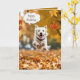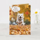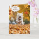 Happy dog running in autumn leaves with speech bubble and Happy Birthday text.