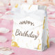 This beautiful Happy Birthday favour box is the perfect way to celebrate your special day. Made from sturdy cardboard, this box is sure to hold your favourite treats and goodies. The bright, cheerful design is sure to bring a smile to everyone's face. Happy Birthday decorated text, with flying gold and silver balloons, golden shiny confetti decoration.