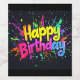 Dynamic zoom in on a vibrant, colorful 'Happy Birthday' text, surrounded by an explosion of paint splashes in vivid hues. The camera sweeps in with a lively, playful motion, emphasizing the joyful energy of the scene. Bright, contrasting colors pop against a dark background, creating a festive atmosphere. The lighting is bright and cheerful, enhancing the celebratory mood. The composition is bold and eye-catching, perfect for a birthday celebration.