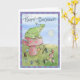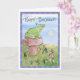 The frog sports a blue spotted birthday hat as he sits on a pink spotted mushroom and is serenaded by a strolling, eleven piece insect band.