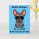 Frenchies, show your Dad some love on his birthday with a personalised card just from you. Message on the front of the card reads “Happy Birthday to the Best Frenchie Dad Ever!" Inside message reads “I love you more than treats, Happy Birthday.” The design features a cute cartoon style illustration of a female lilac and tan coloured french bulldog wearing a pink bow and collar. Font and background colour and be changed by selecting “Click to customise further.”