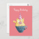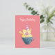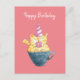 A funny drawing of a ginger cat in a mug, eating a doughnut and wearing a party hat.