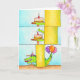 This card comes in three cartoon vignettes. The first one shows a yellow pillar on a sky blue background. On the left of the pillar, a cake stands on a small table. The cake is made of yellow sponge, with a chocolate filling, and pink frosting. On it a red birthday candle is lit. A little green lower jaw extends from behind the pillar and towards the cake. In the second vignette, the upper jaw is snapping down towards the lower jaw. It will snap on the cake.