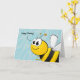 This birthday card features a cute, gigantic smiling bee saying "happy birthday." In the background is a beehive with creative baby blue colours.