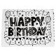 A white gift bag with black lettering that reads "Happy Birthday" and various black doodles. The bag is made of glossy paper and has white rope handles. The lettering is bold and stylized, with each letter filled with different patterns such as stars, dots, and stripes. The doodles include balloons, stars, circles, and wavy lines, creating a festive and celebratory design. The bag is well-lit, highlighting the contrast between the white background and the black graphics.