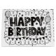 A white gift bag with black lettering that reads "Happy Birthday" and various black doodles. The bag is made of glossy paper and has white rope handles. The lettering is bold and stylised, with each letter filled with different patterns such as stars, dots, and stripes. The doodles include balloons, stars, circles, and wavy lines, creating a festive and celebratory design. The bag is well-lit, highlighting the contrast between the white background and the black graphics.