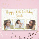 Celebrate a big birthday with this banner featuring 3 photos of the birthday girl/boy and the birthday girl's name, all set against a white background accented with faux gold glitter confetti sparkles. Fun and festive perfect for any birthday celebration.