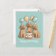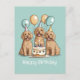 Cute cartoon illustration of Goldendoodle dogs wearing a birthday hat surrounding a birthday cake and balloons. Perfect for pet lovers or dog parents.