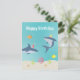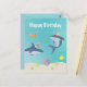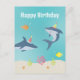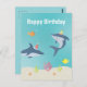 Cute illustration of great white sharks and fish in the ocean. Decorated with birthday party hats.